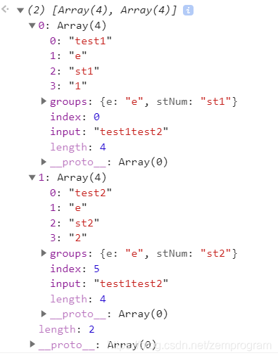 该方法会将字符串与传入的正则进行匹配,返回每个匹配的结果及每个分组的匹配结果,groups为有命名的分组名及其值,index为匹配开始的下标,length为返回的数组长度